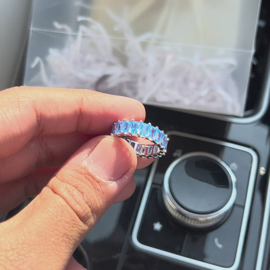 This ring embodies the serene tranquility of ocean waves—each icy blue baguette is a tribute to moments of clarity and calm. It’s the perfect keepsake for those who cherish the quiet magic of the sea and the peace found in its endless hues.