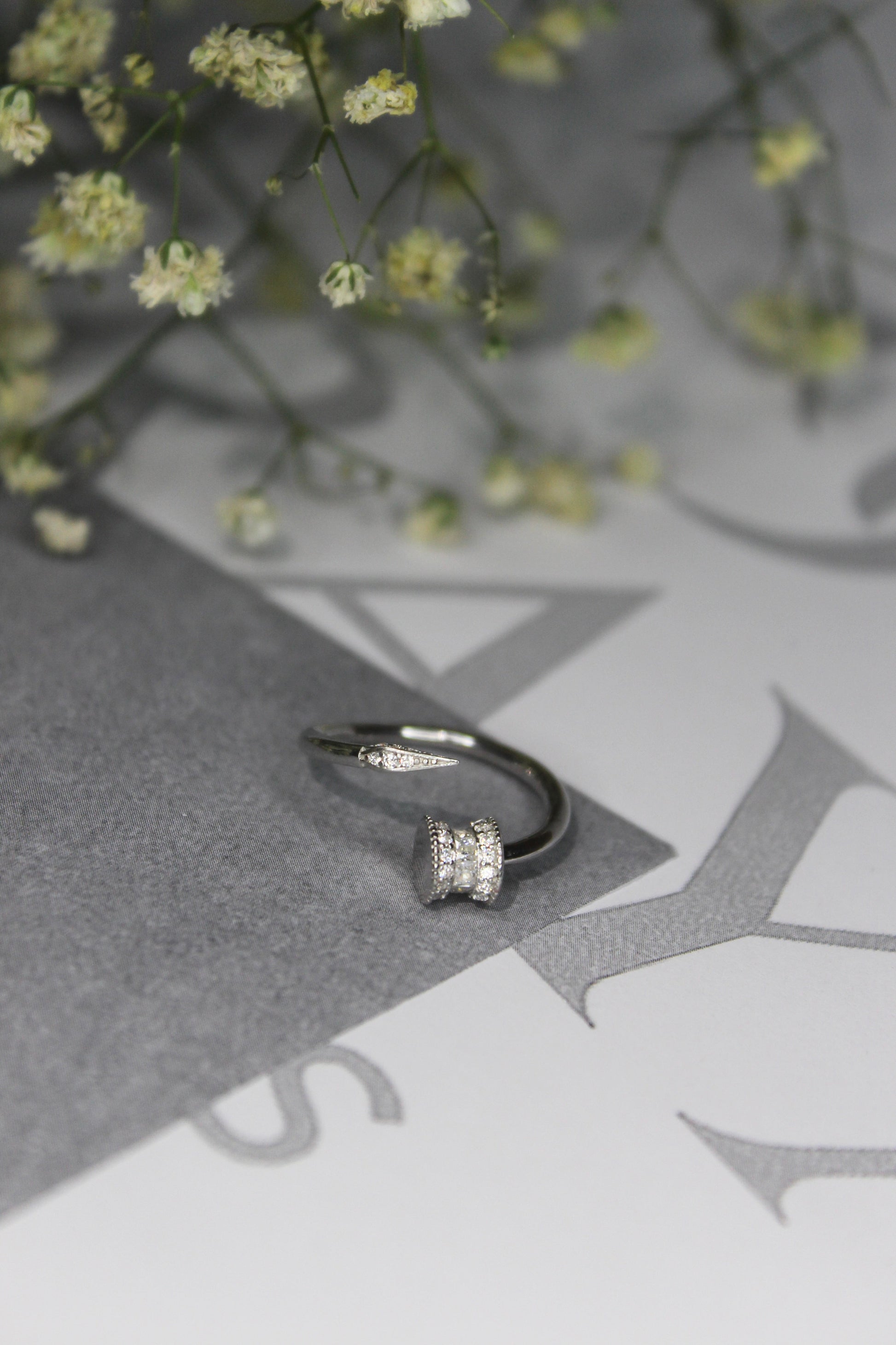 A sleek 925 sterling silver open ring featuring a pointed arrow tip on one side, Inspired by Cartier's Nail edition, with a pave CZ band detail on the other. Adjustable for a perfect fit.