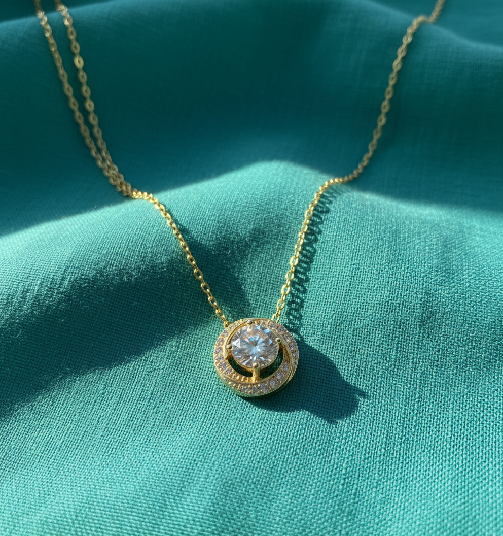 Expertly made in high-polish 925 sterling silver with rich gold plating, the pendant showcases a solitaire round-cut cubic zirconia set at the heart of an orbit-inspired double halo. The chain is buttery smooth and adjustable for layered looks or everyday wear.