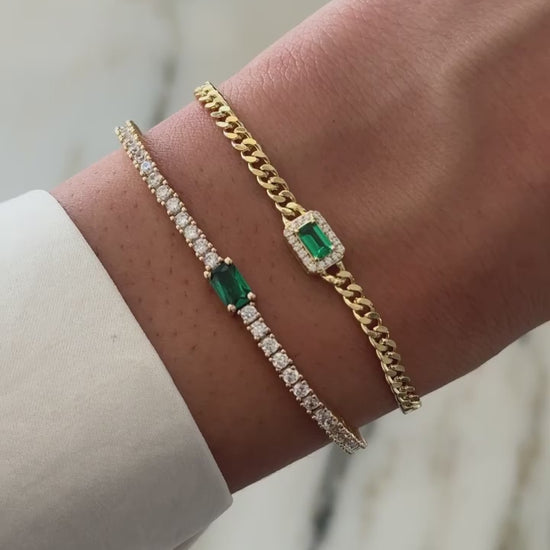 Celebrate love and individuality with our Emerald Stone Tennis Bracelet—a captivating blend of timeless elegance and modern romance. Each bracelet features a sparkling row of brilliant stones, highlighted by a emerald-shaped centerpiece in your choice of enchanting color.