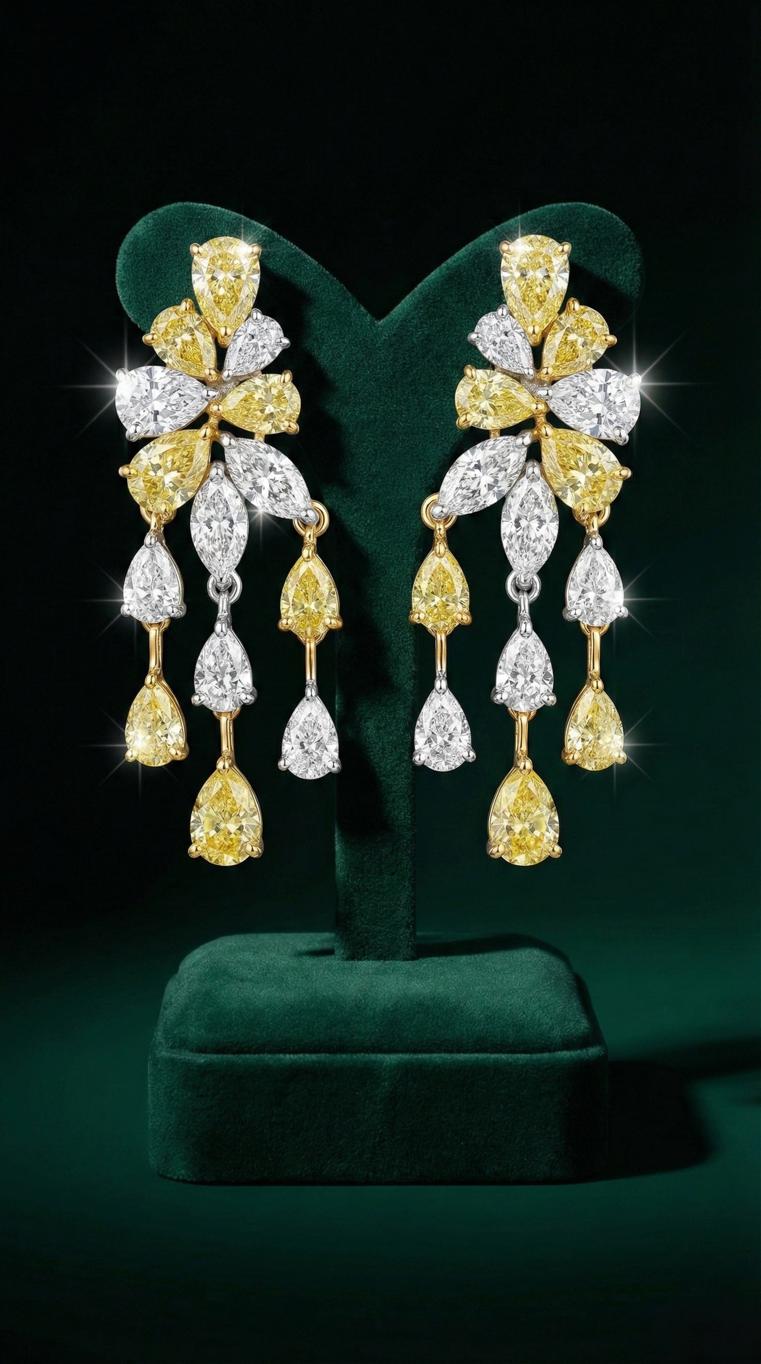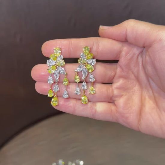 A breathtaking symphony of fancy yellow and white Moissanite in pear and marquise cuts, arranged into a floral cluster with cascading drops. These earrings embody opulence, movement, and artistry — designed to capture light with every turn of the head. Perfect for the woman who wants her jewels to tell a story of grandeur.