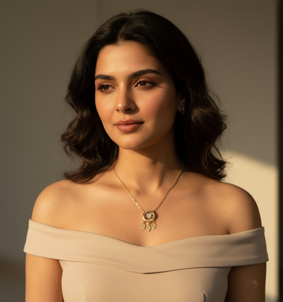 Drawing from the energy of dreams and radiance, this pendant pairs a sparkling center stone with a luminous golden halo and whimsical leaf charms—symbolizing hope, clarity, and graceful movement.