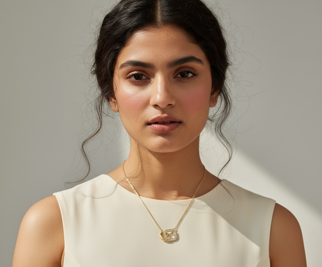 Inspired by the beauty of unity and connection, this necklace features two interlinked golden rings—one with a freeform organic silhouette and pavé-set stones, the other polished and sleek—symbolizing endless bonds and graceful simplicity.