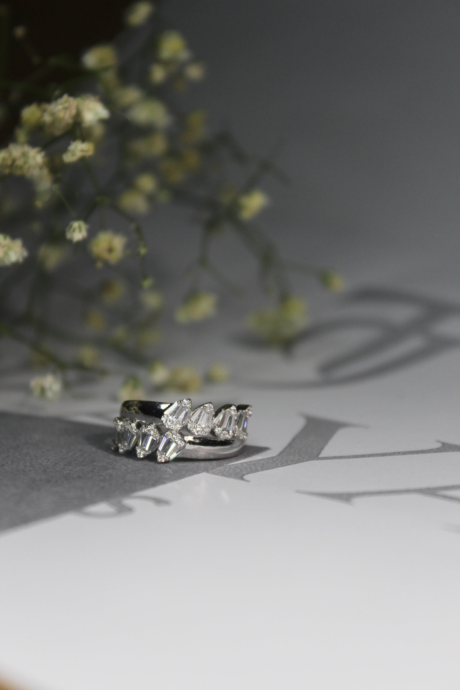 A 925 sterling silver band featuring alternating marquise and baguette cut cubic zirconia, arranged like sparkling leaves. A modern yet timeless design.
