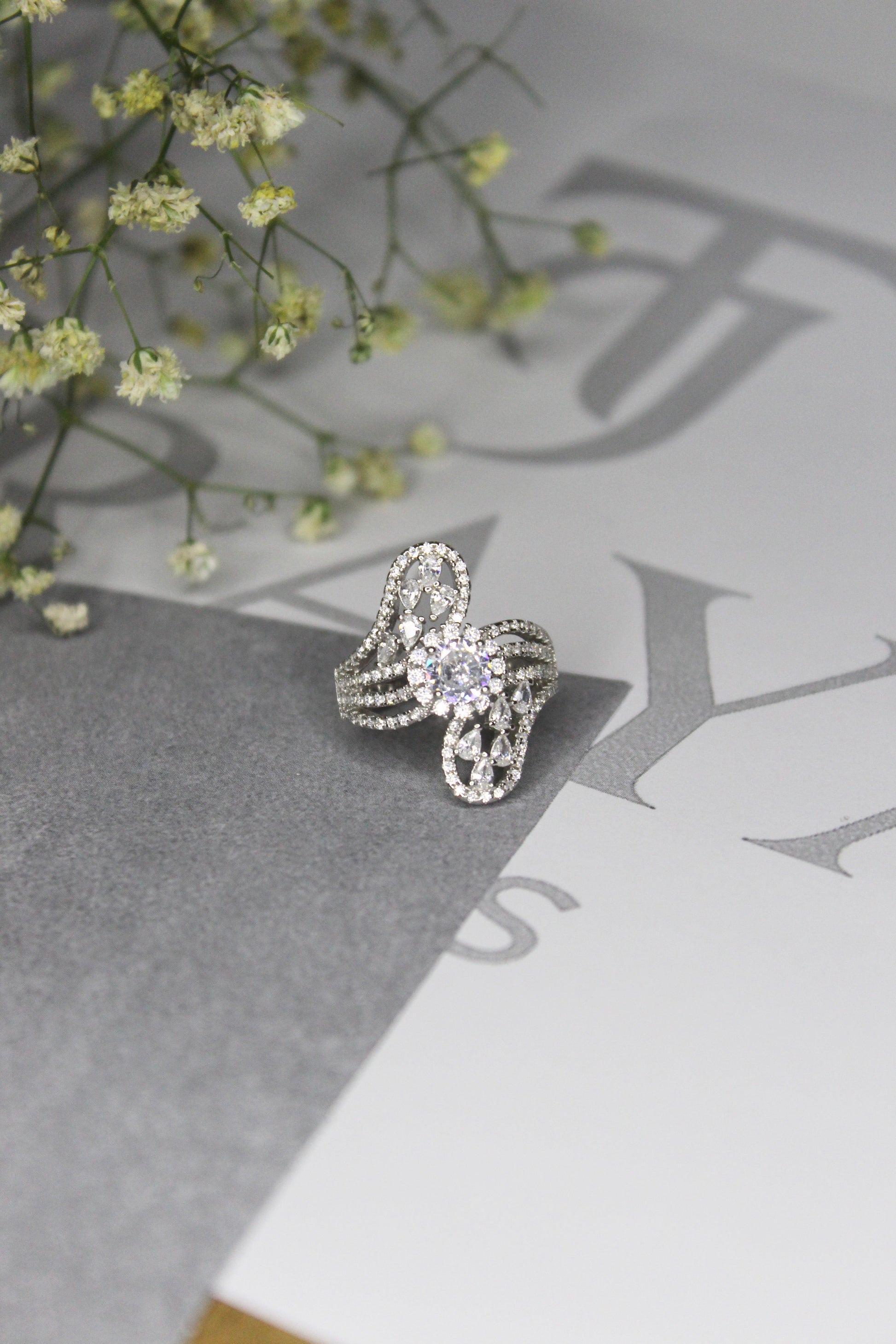 An intricate 925 sterling silver swirl design ring with sparkling cubic zirconia all over, symbolizing infinity and grace. A standout piece for everyday glam or parties.