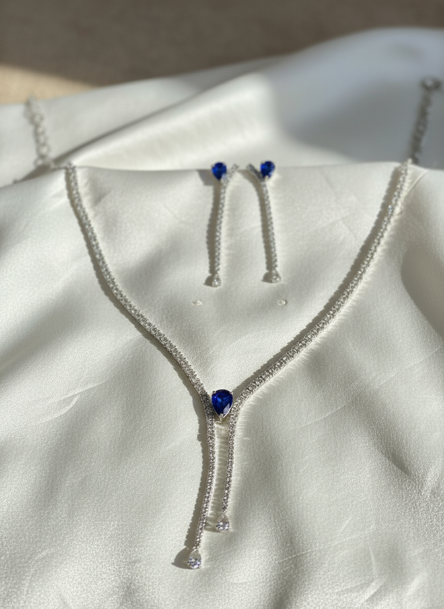 Handcrafted in luminous 925 sterling silver, the necklace and matching earrings showcase a gleaming row of brilliant-cut cubic zirconia culminating in a striking sapphire-blue pear-cut stone. The Y-shaped silhouette adds a refined touch, while each piece is finished with rhodium plating for enduring shine.