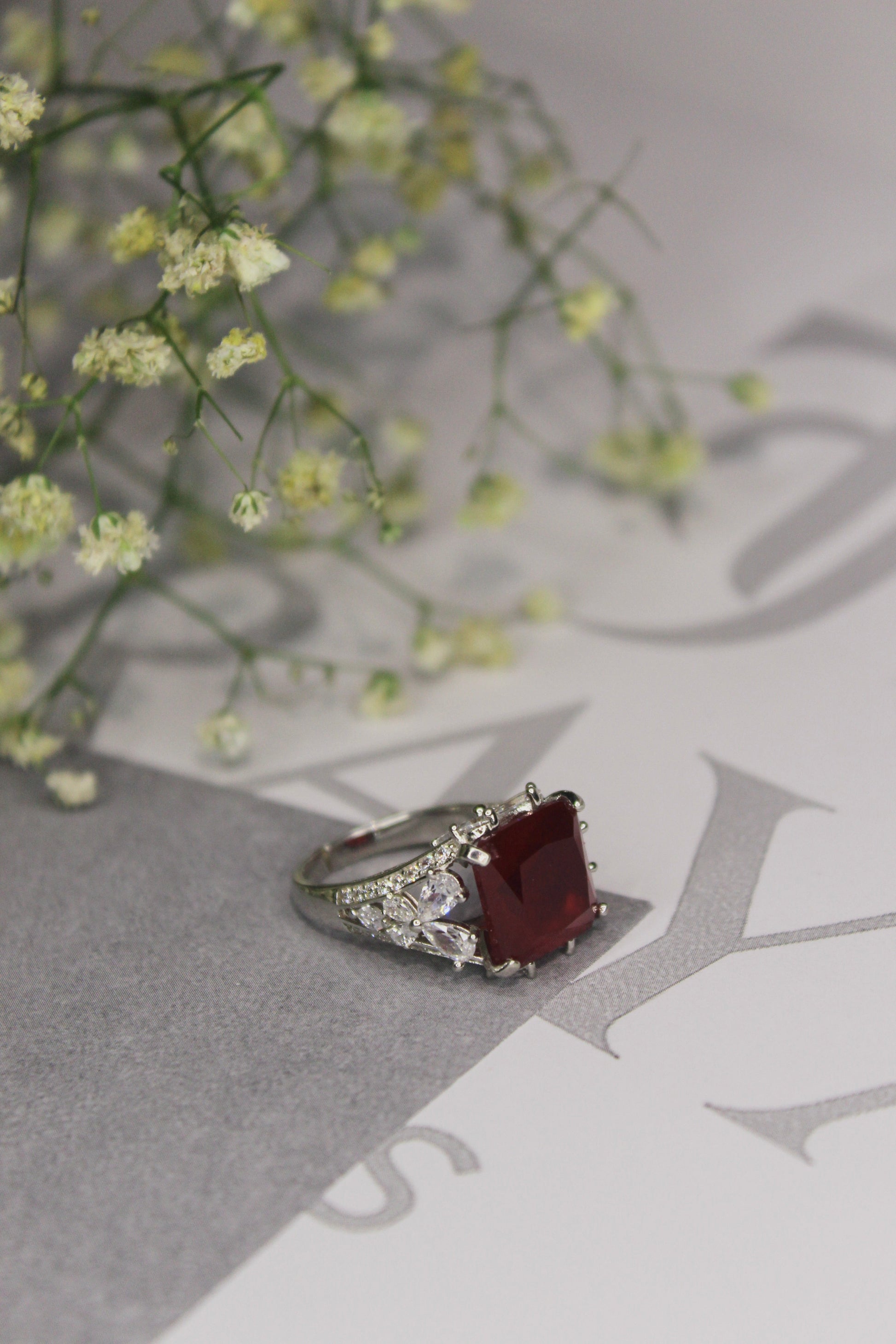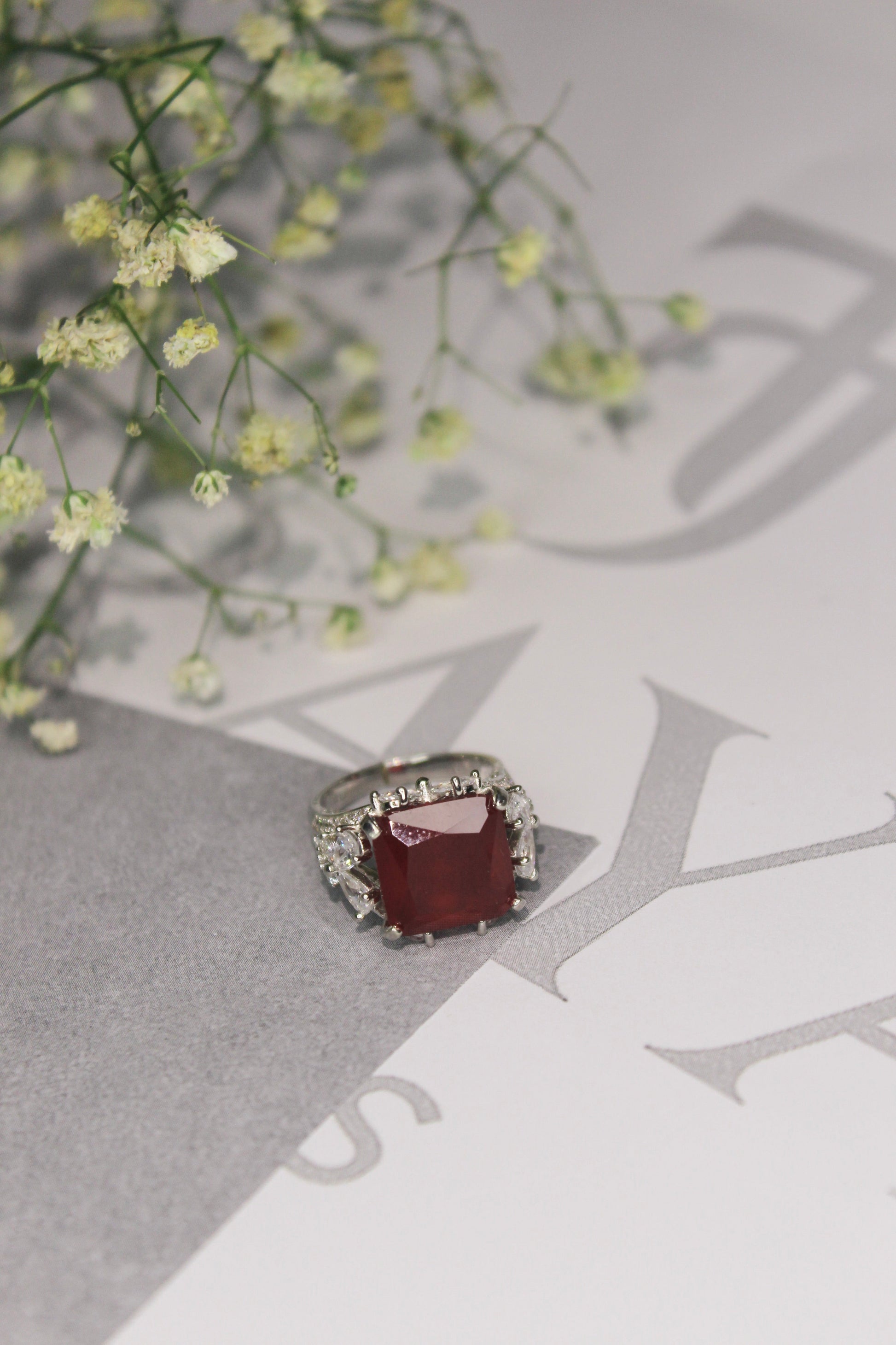 A bold square-cut red gemstone set in 925 sterling silver, with sparkling side stones for extra shine. A perfect cocktail or evening ring.