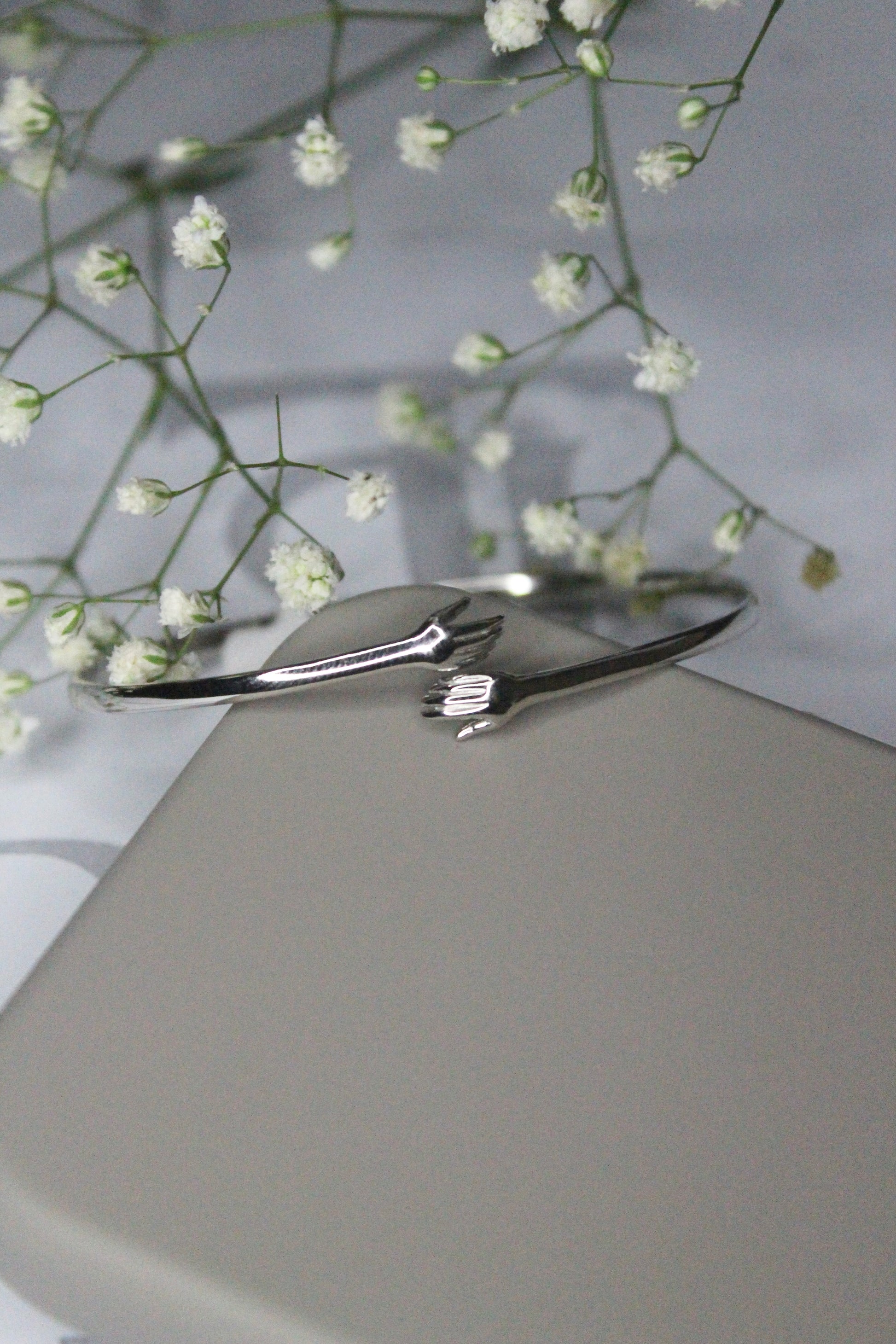 Handcrafted in polished 925 sterling silver, the sleek cuff features delicately sculpted hands at each end. The minimalist design is both contemporary and timeless, offering effortless style and easy wear for any wrist.