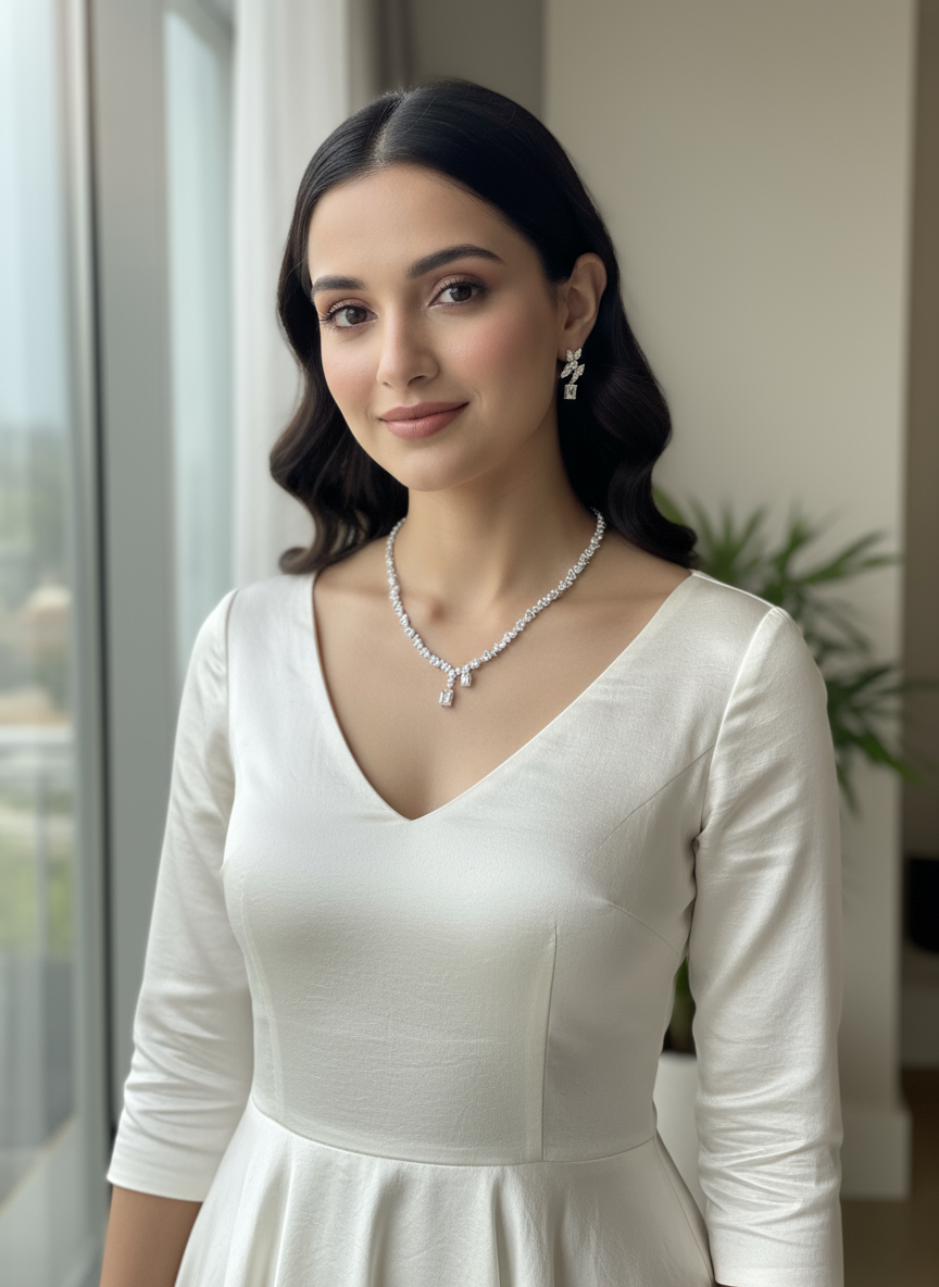 Expertly fashioned from 925 sterling silver, the V-shaped necklace and coordinating earrings feature a central emerald-cut cubic zirconia suspended beneath a cluster of shimmering marquise and pear cuts. Each stone is meticulously prong-set along a rhodium-plated chain and posts, ensuring maximum brilliance and enduring shine.