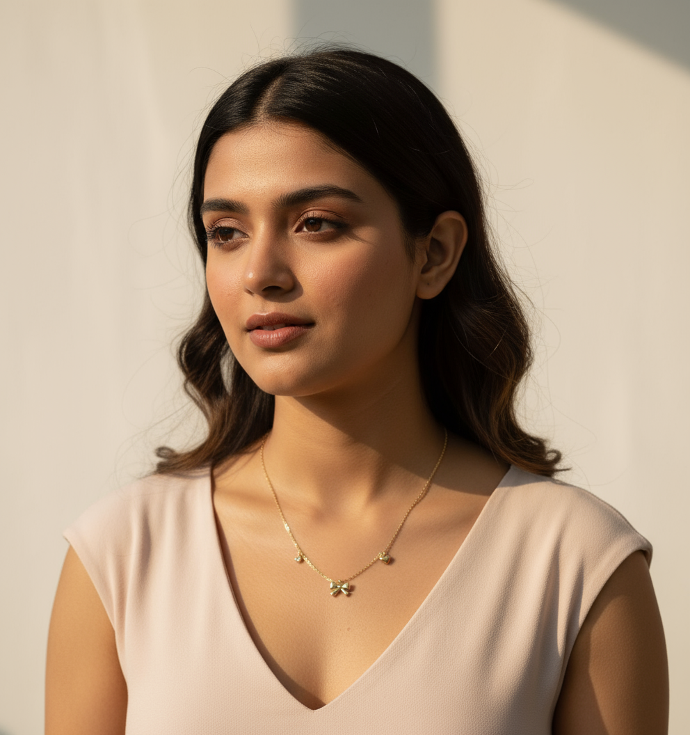 Inspired by timeless femininity and playful charm, this necklace features a petite golden bow flanked by a dainty heart and sparkling accent—reflecting joy, love, and graceful style.