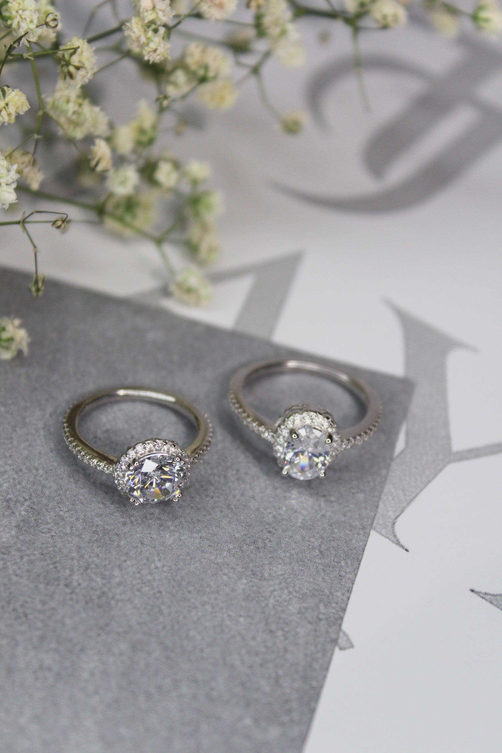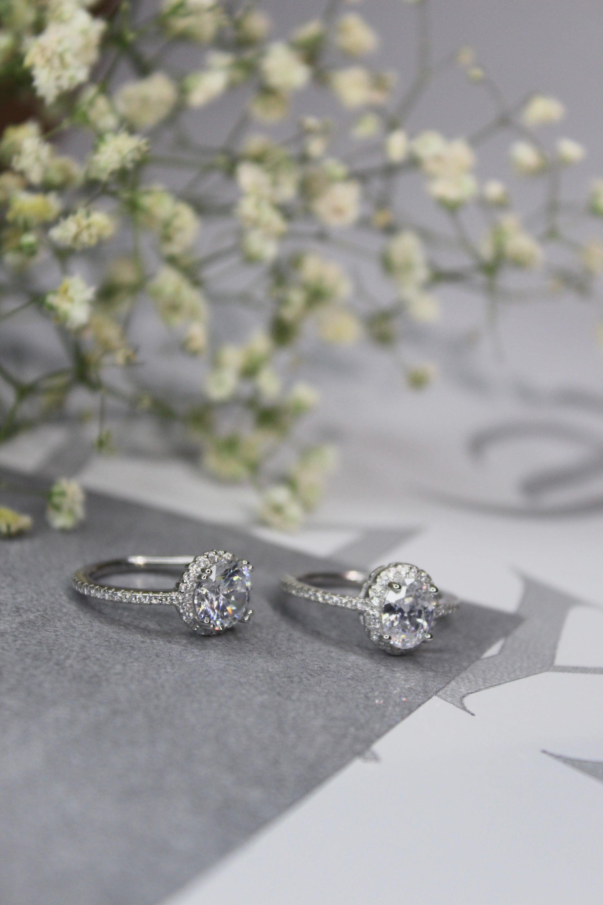 A round centerpiece kissed by a halo of smaller CZ stones. A design of romance eternal, glowing brighter with every glance.