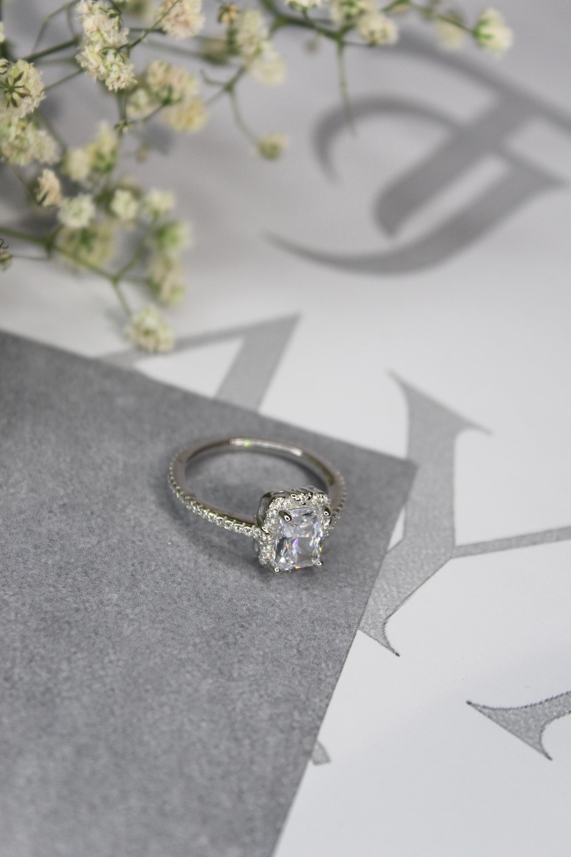 An emerald-cut gemstone framed by a sparkling halo — regal yet tender, like a crown for the everyday queen.